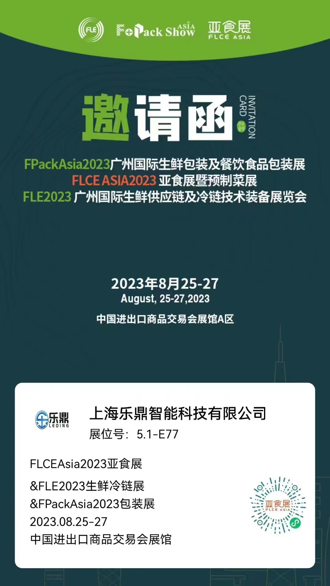 沐鷹智能上海公司(上海樂鼎智能科技有限公司)于8.25-8.27日在廣州廣交會(huì)展參加2023FLCEAsia亞食展暨預(yù)制菜展,展位號:5.1-E77, 歡迎新老客戶過來現(xiàn)場參觀和指導(dǎo)!