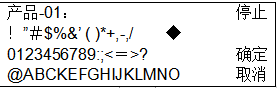 按[箭頭]鍵,將光標(biāo)對(duì)準(zhǔn)輸入文字的位置(英文數(shù)字,假名,記號(hào)),按[確認(rèn)] 鍵,則可以在[品名區(qū)域]中輸入。向左移動(dòng),向右移動(dòng)按[箭頭]鍵,將對(duì)準(zhǔn)[向左移動(dòng)]或[向右移動(dòng)]的位置,按[確認(rèn)]鍵,則[品名區(qū)域]的文字選擇位置向左或向右移動(dòng)。